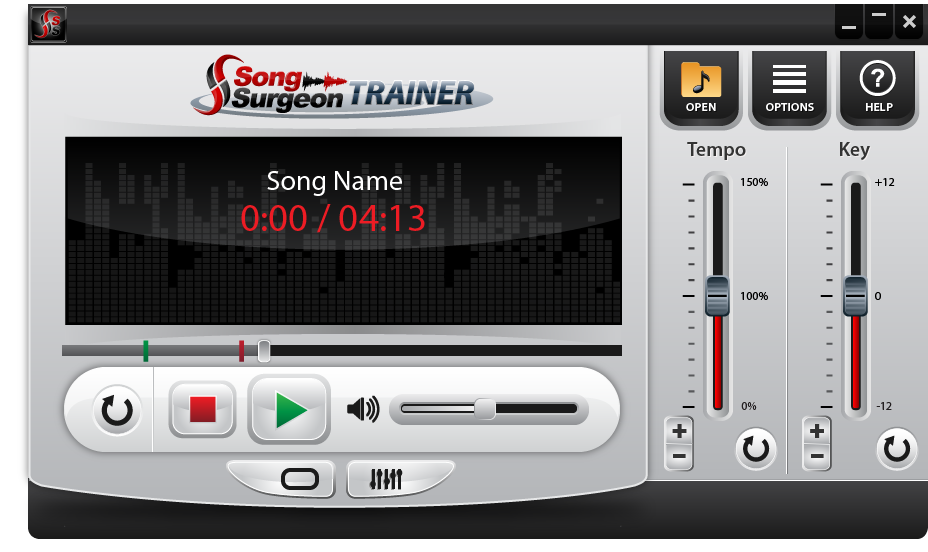 Song Surgeon Trainer è un rallentatore audio da desktop livello base. Modifica la chiave e il tempo, permette la creazione di un'area di looping per la riproduzione ripetitiva, e ha un EQ a 9 bande. Tutte queste funzioni possono essere applicate in tempo reale. Song Surgeon Trainer permette ai musicisti di accedere alla funzione di rallentare e riprodurre ad anello l'audio come tool di apprendimento. I risultati dalla nostra indagine tra i musicisti ha dimostrato che rallentare una canzone o della musica come mezzo per fare pratica ha incrementato la loro capacità di apprendimento di circa 614%.