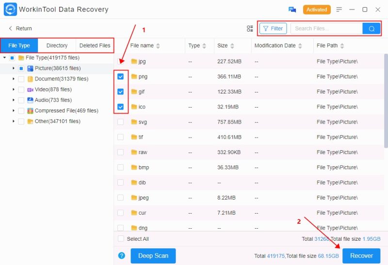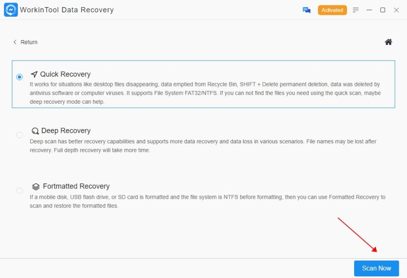 WorkinTool Data Recovery offre 2 modalità di scansione: una rapida e una profonda (deep).