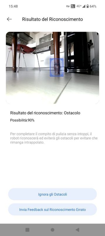 In entrambi i casi tutti gli ostacoli sono stati riconosciuti ed evitati alla perfezione (compresi i fili elettrici), ma devo segnalare che solo il Dreame scatta una foto agli ostacoli, li identifica correttamente e ce li segnala sull'app.