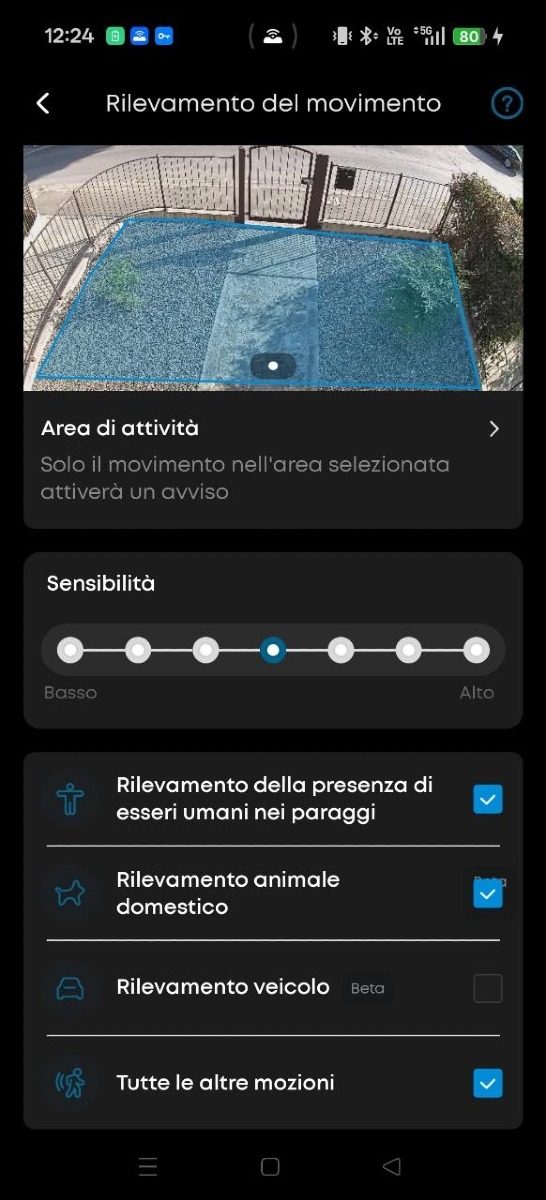 Altro punto importante: non registra 24/7, ma funziona solo su eventi. Questo aiuta su batteria e spazio, ma la rende meno adatta a chi vuole monitoraggio costante.