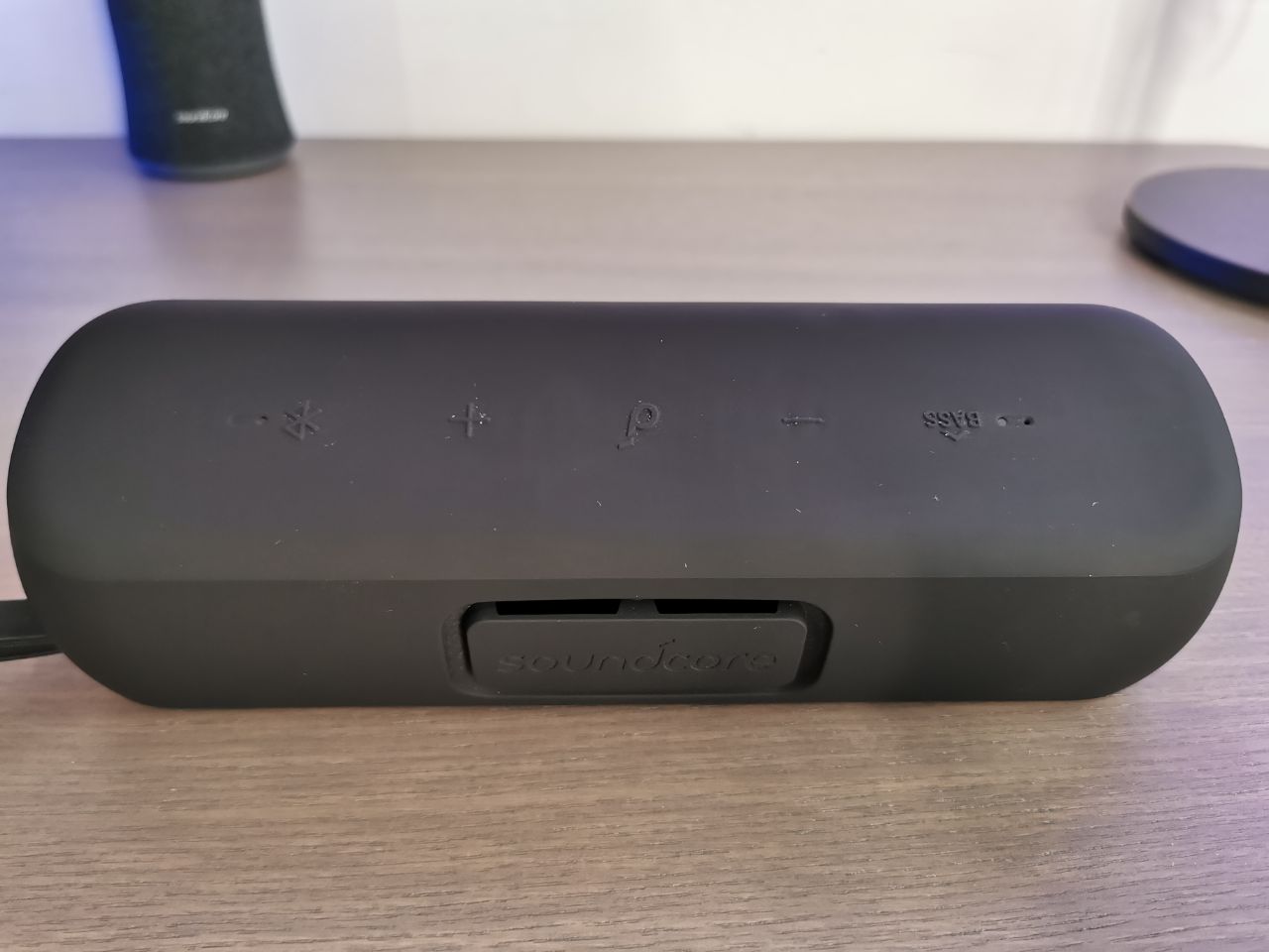 Sul lato troviamo uno sportellino che nasconde gli ingressi AUX e USB-C e il tasto di accensione/spegnimento. Dietro invece c’è una placca con il logo di Soundcore che funge da sfiato per l’aria.