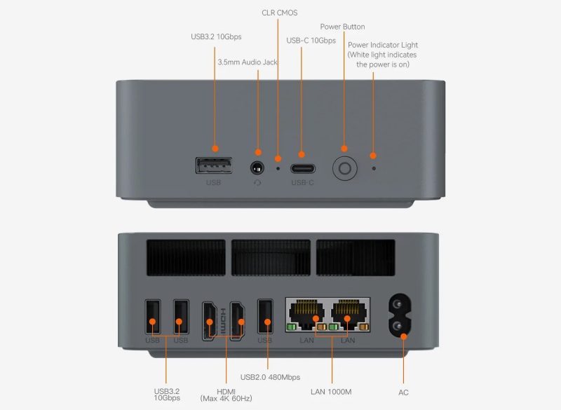 Come anticipato, per raffreddare il mini PC l'aria viene aspirata dalla griglia inferiore ed espulsa dalle ventole tramite la griglia posteriore.