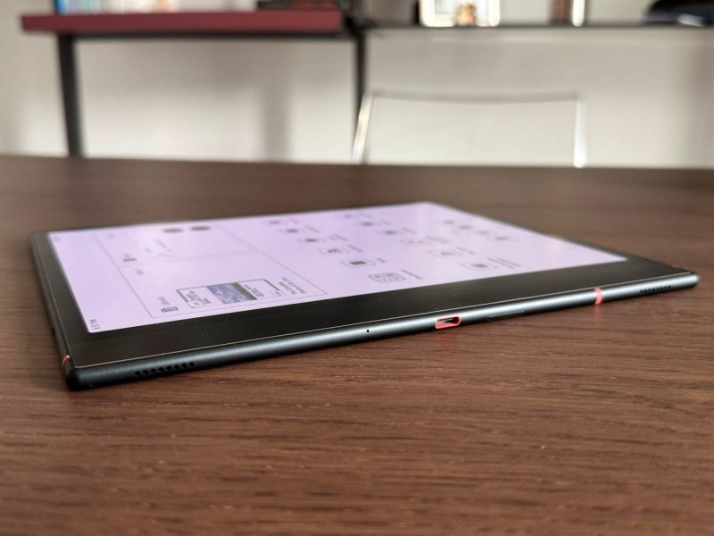 Con uno spessore di soli 5,8 mm e un peso di 420-430 grammi, è notevolmente sottile e leggero, rendendolo comodo da tenere anche con una mano sola per sessioni prolungate di lettura o scrittura.