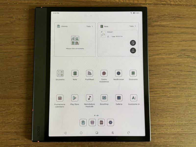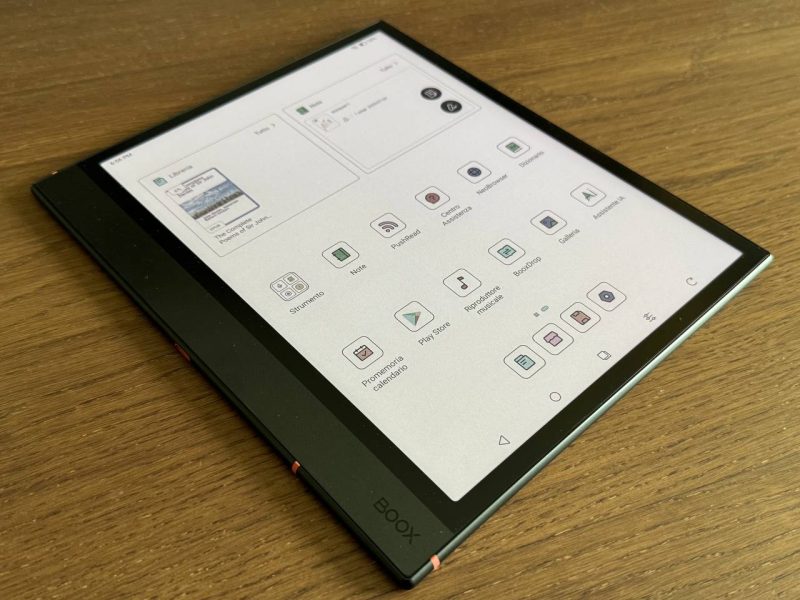 L'interfaccia utente è altamente personalizzata da BOOX, con un dock personalizzabile e widget sulla schermata principale.