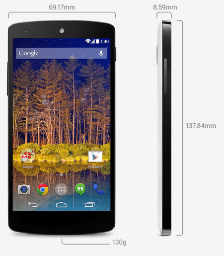 Il Nexus 5 pesa appena 130 grammi (contro i 139 del Nexus 4) e misura 137,84 x 69,17 x 8,59 mm quindi rispetto al suo predecessore (133.9 x 68.7 x 9.1 mm) è più leggero, più stretto e più sottile ma è anche più alto di circa 4 mm, in mano la leggerezza è davvero impressionante, il Nexus 5 risulta leggero.