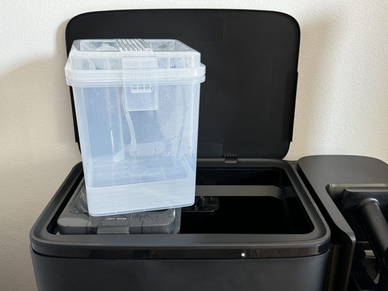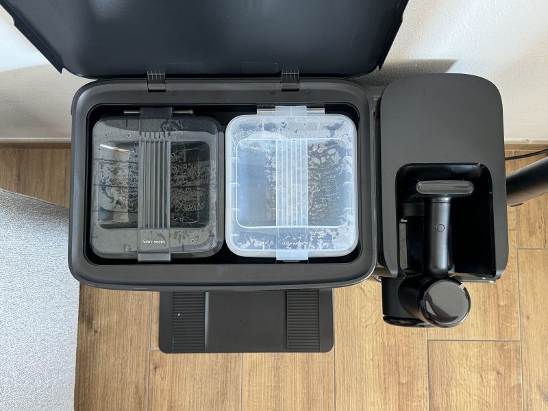 Internamente, anche se non accessibile, è presente un piccolo serbatoio di acqua da 55ml che viene riempito automaticamente dalla stazione di ricarica e permette di avere i mop sempre bagnati durante il lavaggio dei pavimenti.