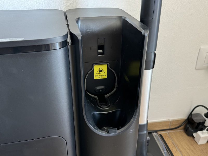 Terminata l'aspirazione è sufficiente riporre il corpo della scopa elettrica nella base del robot per avviare la ricarica e lo svuotamento automatico del serbatoio della polvere (che finisce nello stesso sacchetto del robot).