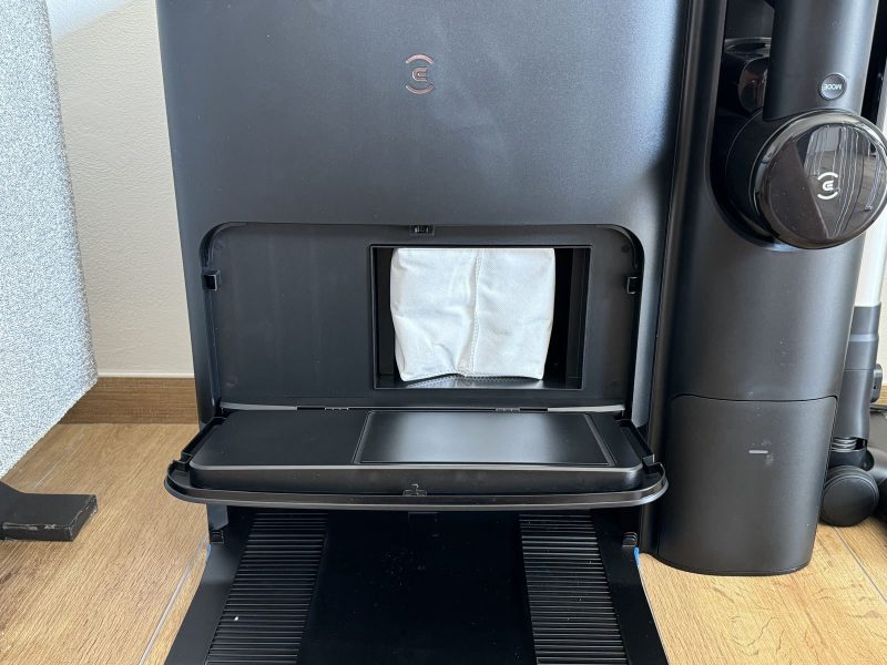 È poi presente una copertura in plastica magnetica che, una volta sollevata, ci permette di accedere alla vaschetta della polvere da 275ml. Il robot comunque si svuota automaticamente dopo ogni pulizia.