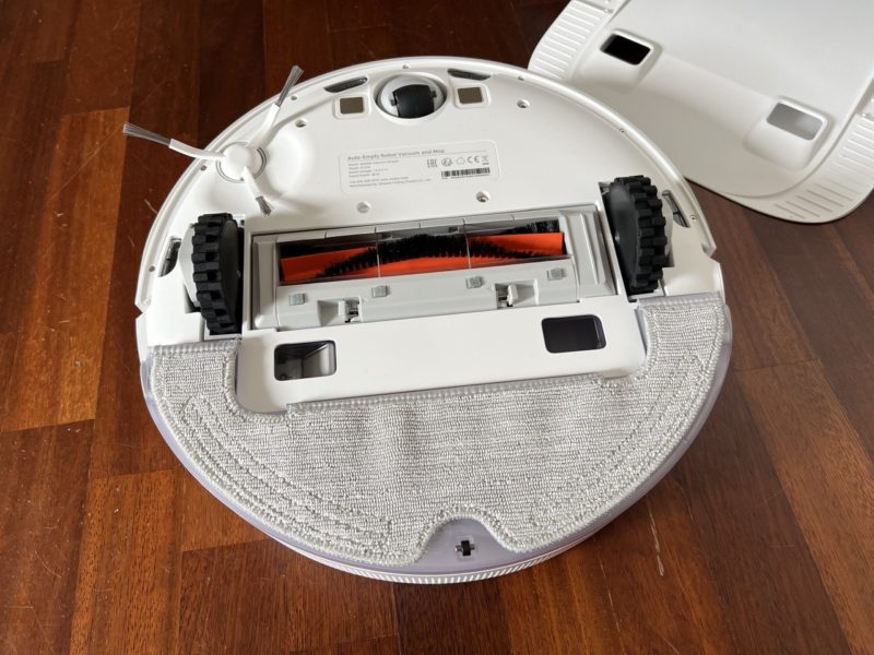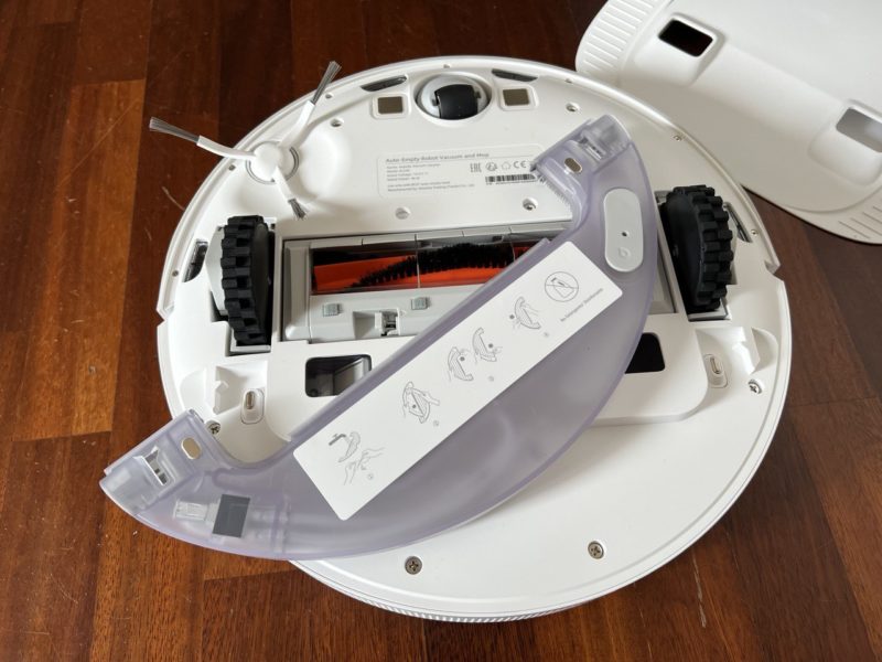 Nella parte inferiore troviamo invece la bocchetta di aspirazione larga 17cm, le ruote che possono superare ostacoli fino a 2cm, i sensori anti-caduta, gli agganci magnetici per la ricarica e l'attacco per la vaschetta di lavaggio.