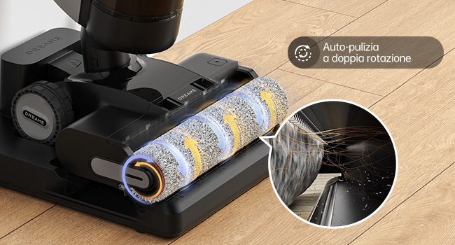 - auto-pulizia a doppia rotazione: in senso orario il raschietto fa fuoriuscire l'acqua ed elimina lo sporco, nell'altro senso elimina i capelli in modo intelligente e li dirige verso il serbatoio dell'acqua sporca