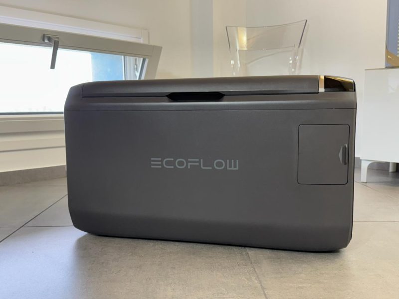 Sui lati lunghi spicca il logo EcoFlow, mentre su quelli corti abbiamo le grandi griglie di ventilazione ben rifinite e protette.