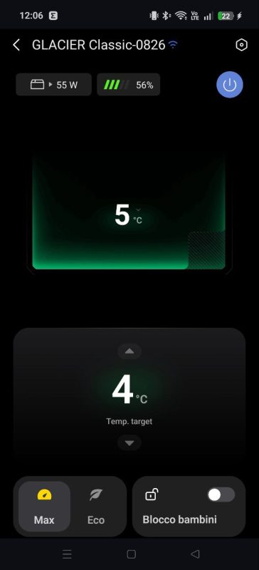 Quando è completamente carica è in grado di fornire energia fino a 43 ore impostando una temperatura interna di 4°, ma chiaramente i consumi dipendono da tantissimi parametri, come la temperatura ambientale e quella che impostiamo come target.