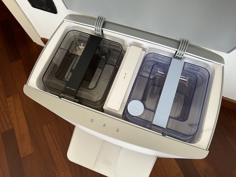Vista l'assenza della vaschetta dell'acqua, in questo caso i mop NON vengono inumiditi durante il lavaggio, ma vengono bagnati dalla stazione di ricarica e restano umidi dopo ogni lavaggio (che avviene ad intervalli regolari e personalizzabili durante la pulizia della casa).