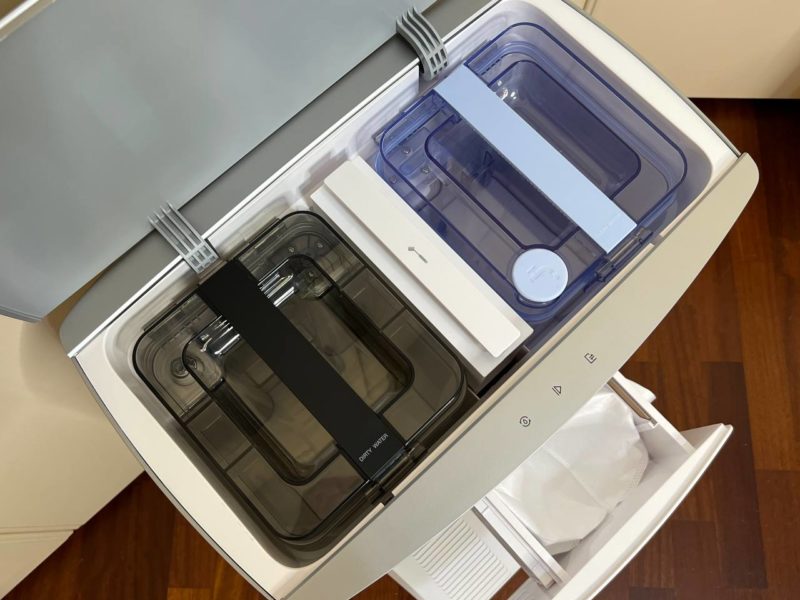 Oltre al sacchetto di raccolta della polvere, al suo interno troviamo i 2 serbatoi da 4L: uno per l'acqua pulita e l'altro per acqua sporca. Il contenitore dell'acqua pulita serve in questo caso solo per lavare le spazzole rotanti durante e dopo la pulizia.