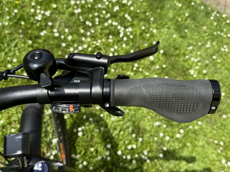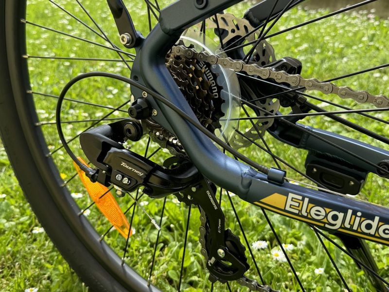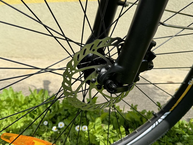 Per quanto riguarda il cambio, abbiamo uno Shimano Tourney a 7 rapporti monocorona (il più diffuso su questo genere di biciclette).