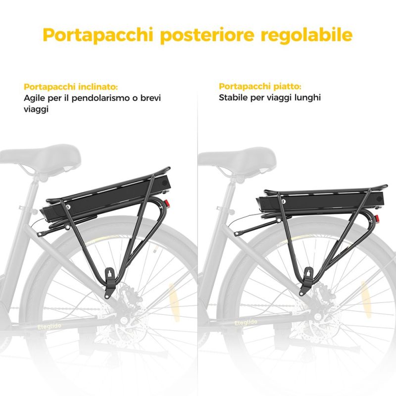 - il comodissimo portapacchi posteriore, in grado di sopportare fino a 25 kg di peso. Segnalo inoltre che possiamo scegliere se usare il portapacchi in posizione piatta o leggermente inclinata, in versione più agile per pendolarismo o viaggi brevi