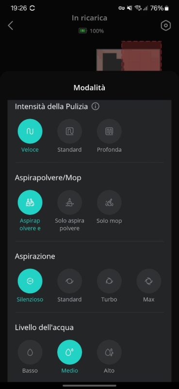 Tramite l'app possiamo scegliere 4 livelli di potenza aspirante.