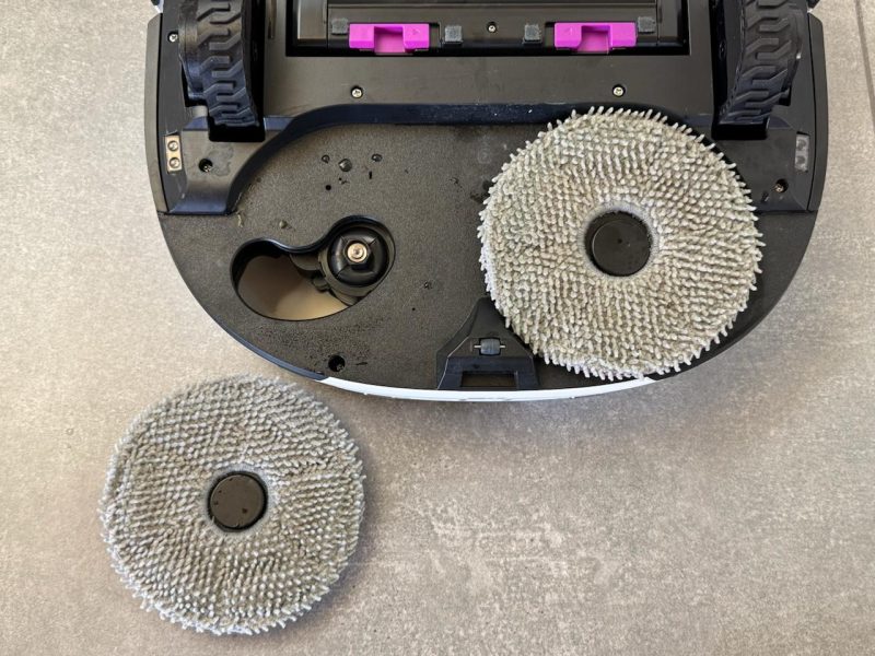 - i mop possono essere sollevati fino a 12mm per evitare di bagnare i tappeti o quando il robot si allontana o torna alla base, ma non li può staccare e lasciare automaticamente nella base