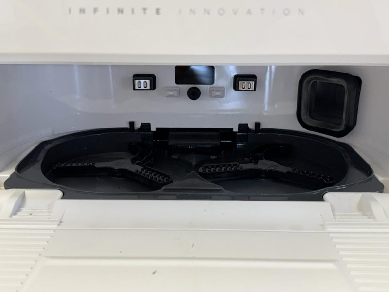 Nella parte superiore troviamo 2 pulsanti e la copertura in plastica a saracinesca che permette di accedere alla vaschetta della polvere interna.