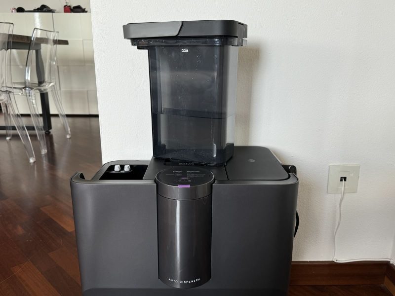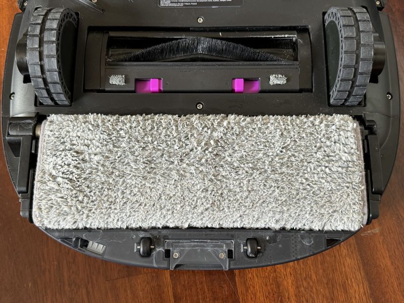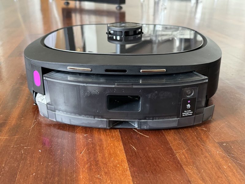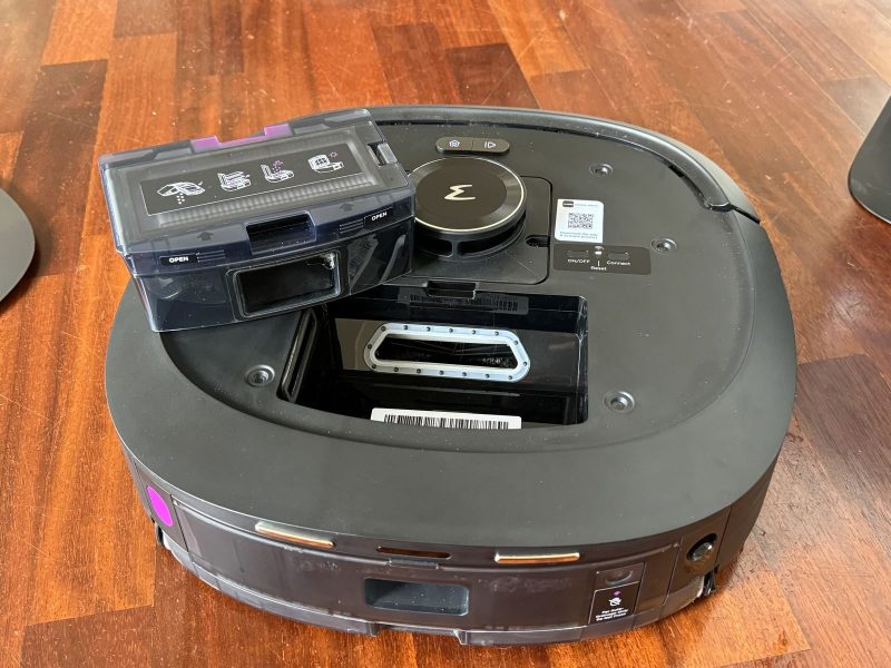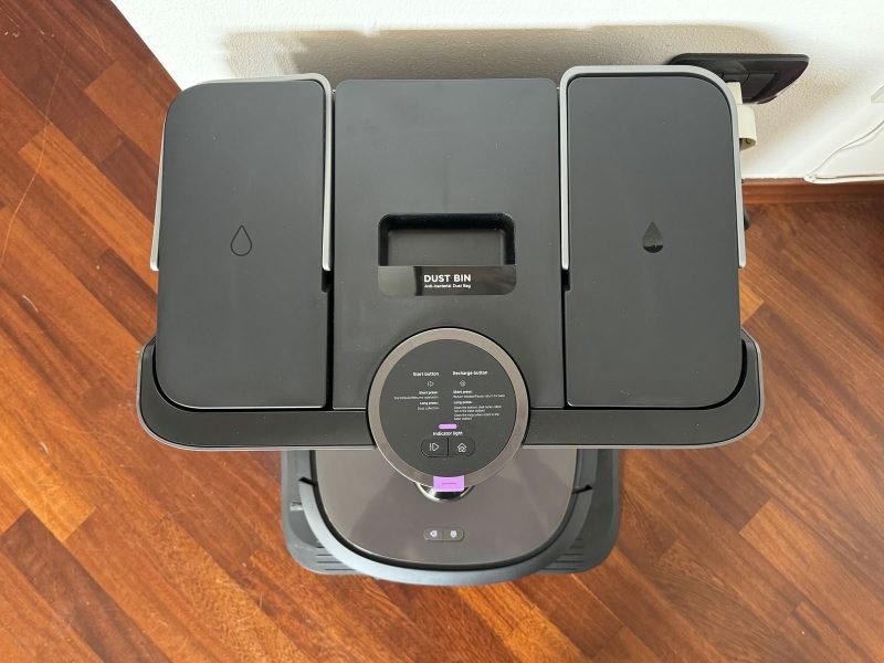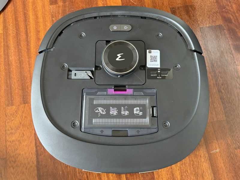 Anche se non visibile, internamente è anche presente una vaschetta per l'acqua pulita da 240ml: il robot la riempie ogni volta che torna alla base e utilizza l'acqua per lavare continuamente il rullo posteriore (nota: lavare, non inumidire).