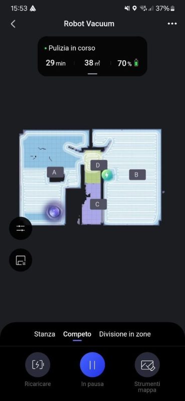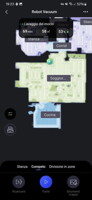 La prima mappatura è stata molto veloce: l'ha completata in pochi minuti, ma ha unito erroneamente sala, cucina e corridoio. Ho risolto separando le stanze tramite l'app in pochi click.