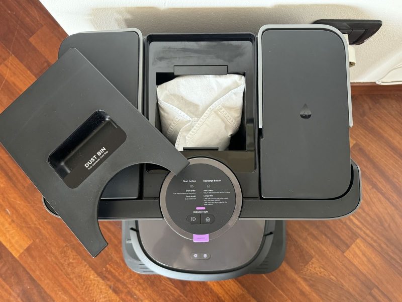 È poi presente una copertura in plastica magnetica che, una volta sollevata, ci permette di accedere alla vaschetta della polvere interna. Non sarà necessario svuotarla a mano visto che lo fa il robot in autonomia.