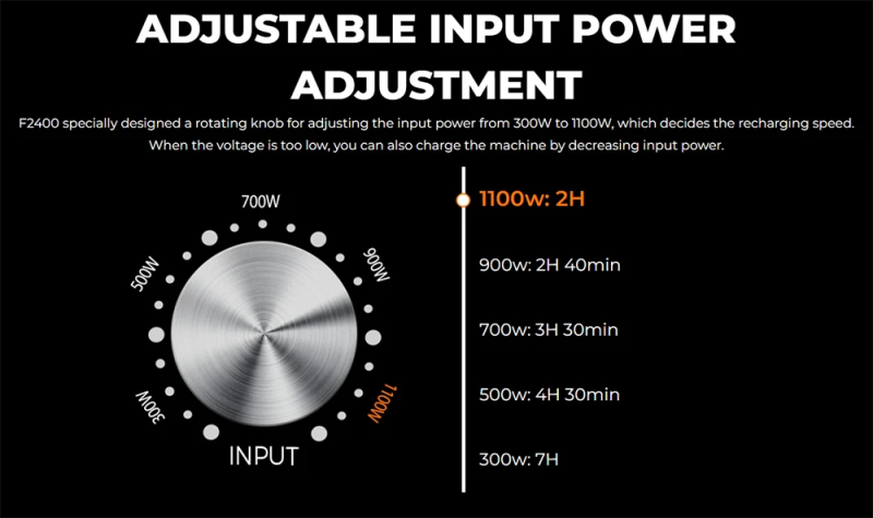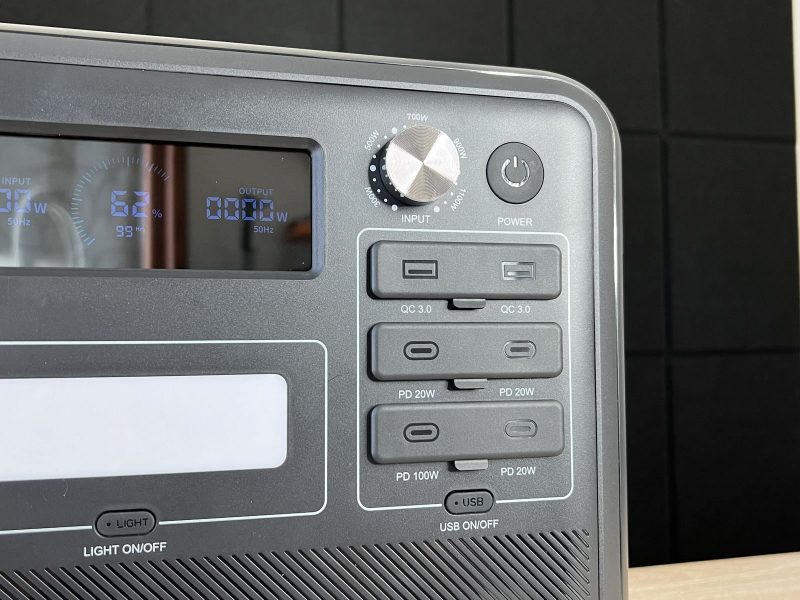 Fantastica la possibilità di regolare la potenza di ricarica in ingresso: tramite la manopola dedicata possiamo scegliere tra 300, 500, 700, 900 e 1100 W. E' la prima volta che vedo questa funzionalità.