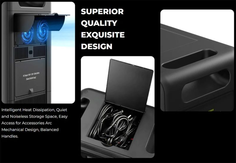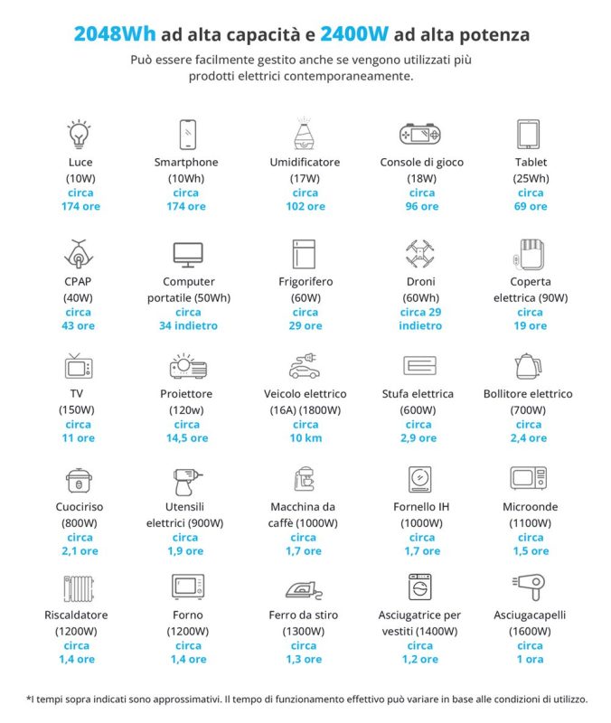 Essendo un generatore portatile da 2400W (2048Wh), permette di ricaricare vari dispositivi elettrici e di alimentare anche tutti gli elettrodomestici di casa per qualche ora (ovviamente dipende dal loro consumo energetico).