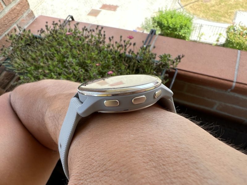 - sul lato destro sono ora presenti 3 pulsanti (prima 2) perché uno è dedicato all'assistente vocale. I pulsanti fisici sono a filo e sono davvero comodissimi per interagire con lo smartwatch durante le sessioni di allenamento