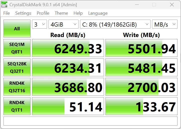 Davvero molto veloce, con valori di circa 6000 MB/s in lettura e 5000 MB/s in scrittura.