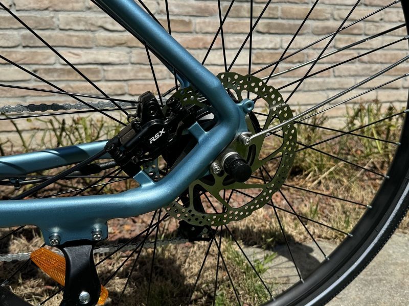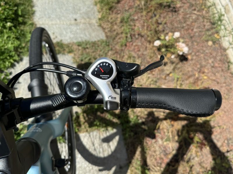 Per quanto riguarda il cambio abbiamo uno Shimano Tourney monocorona a 7 rapporti (super diffuso su questo tipo di bici), che sono ben calibrati e perfetti per pedalare sia lentamente in città che ad alte velocità.