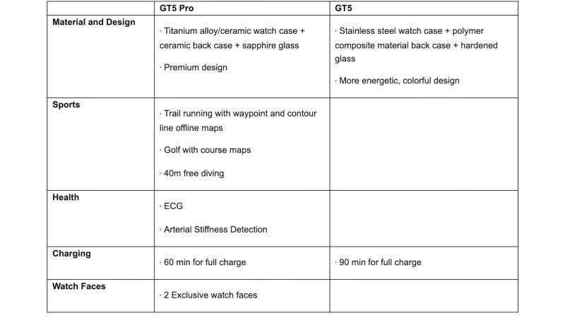 Per concludere, ecco un confronto tra HUAWEI WATCH GT 5 e HUAWEI WATCH GT 5 Pro per capire meglio analogie e differenze.