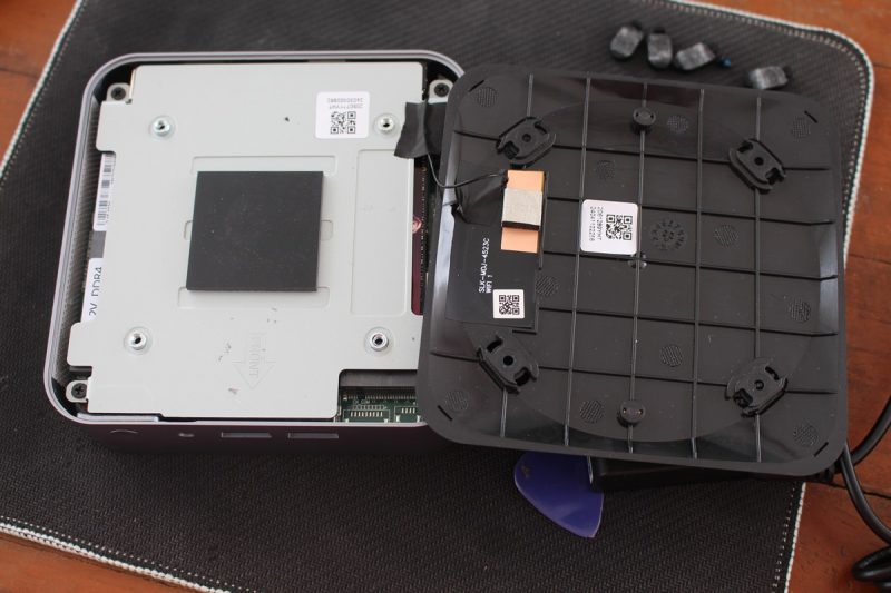 Tramite le viti posizionate nella parte inferiore (e nascoste sotto ai piedini in gomma) possiamo smontare il mini pc per potenziare RAM e memoria interna. Quando si smonta, però, bisogna fare molta attenzione all'antenna del WiFi, altrimenti si rischia di staccarla e romperla.