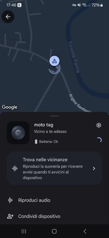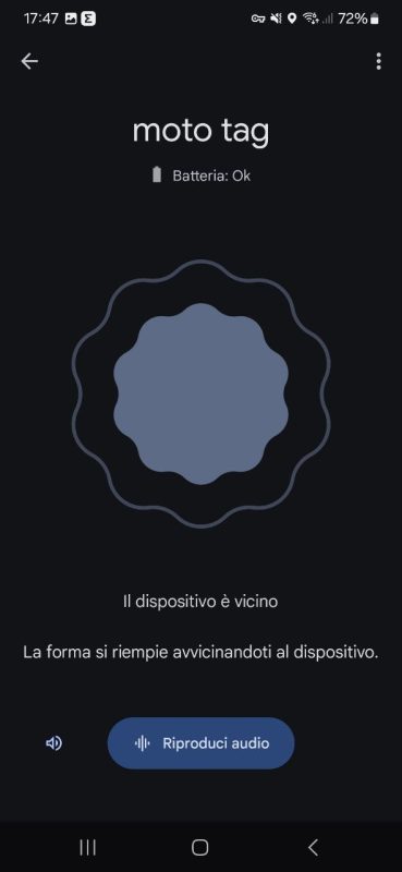Fino a quando siamo in prossimità delle chiavi, e quindi connessi direttamente in Bluetooth a Moto Tag, possiamo farlo suonare dall'app "Trova il mio dispositivo" per rintracciarlo rapidamente.