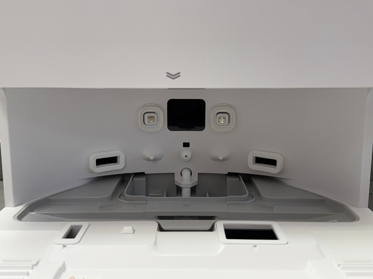 Nella parte superiore troviamo 2 pulsanti e la copertura in plastica che permette di accedere alla vaschetta della polvere da 240ml. Il robot la svuota automaticamente quando torna alla base.