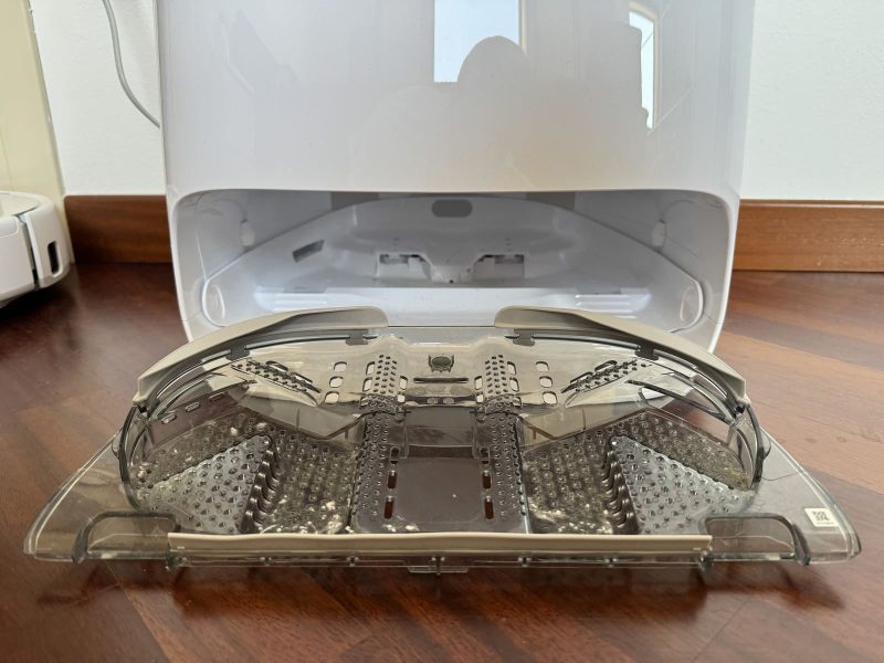 - spazio per la ricarica del robot e per il lavaggio dei mop. Come sui concorrenti, anche qui possiamo facilmente estrarre la griglia di lavaggio dei pannetti per pulirla manualmente, anche se devo dire che non è mai stato necessario perché non si è mai accumulata sporcizia