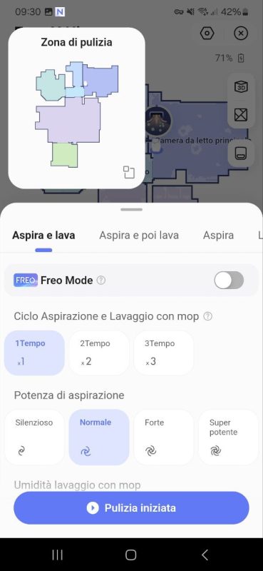 La prima soluzione a nostra disposizione è quella Freo Mode: il robot usa i suoi sensori e l'intelligenza artificiale per studiare il registro di pulizia, analizzare i pavimenti, le stanze e il loro livello di sporco e decidere in autonomia la potenza di aspirazione e la quantità di acqua da usare.