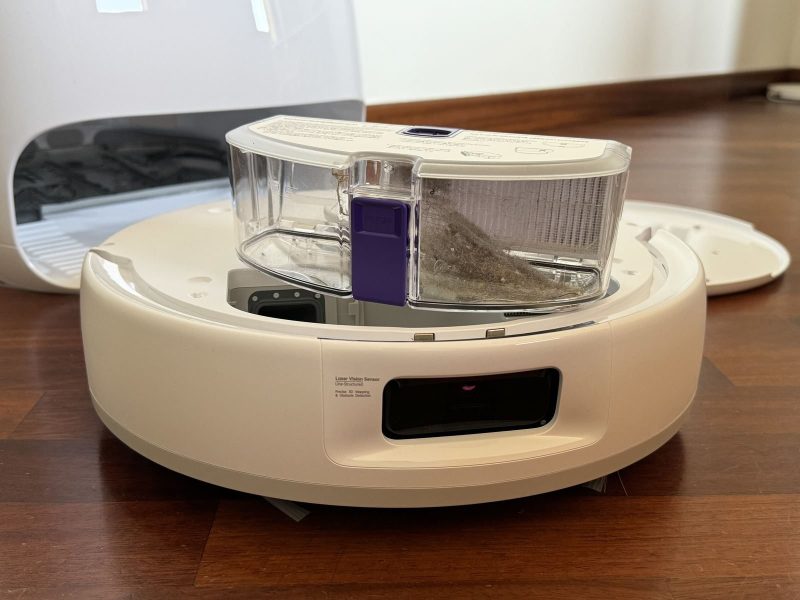 Nella base di Narwal Freo X Ultra non c'è il sacchetto di raccolta della polvere, ma in compenso lui sfrutta una tecnologia innovativa che permette di comprimere quella raccolta direttamente nella sua vaschetta interna.