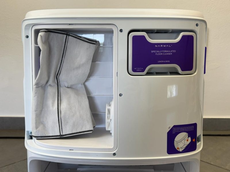 Manca ancora il serbatoio interno di acqua: i moci vengono quindi bagnati solo quando il robot torna alla base, anche se non arrivano mai ad asciugarci completamente durante il lavaggio del pavimento.