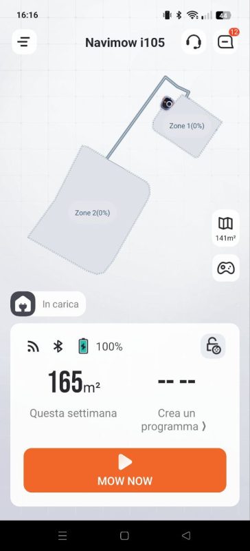 - è possibile salvare solo una mappa per volta, che può essere suddivisa a sua volta in 12 zone. Grande vantaggio rispetto ad altri: lui può tagliare anche zone isolate, che non sono direttamente raggiungibili, nelle quali siamo noi a spostare e posizionare manualmente il robot
