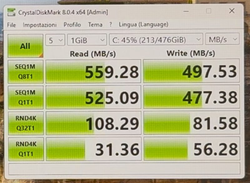 Buona la velocità della memoria SSD, che risulta perfetta per le operazioni di tutti i giorni e non mostra nessun problema nemmeno nel gaming.