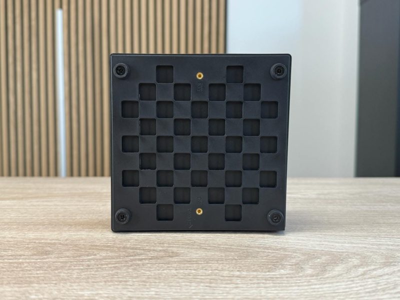 Nella parte inferiore e sui 3 lati troviamo vari fori di aerazione per la gestione delle temperature, mentre in basso abbiamo i piedini in gomma per evitare che il mini PC possa muoversi o scivolare sulla scrivania.