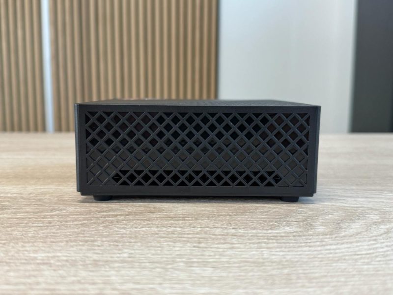 Molto bella la colorazione nera opaca, che non trattiene le ditate. Molto carina anche la texture della scocca, metà liscia e metà lavorata con dettagli geometrici, che rende questo mini PC unico e diverso dagli altri.
