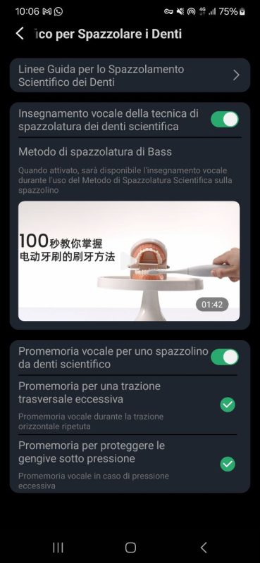 È presente anche una utilissima guida vocale in italiano che in tempo reale che ci avvisa ad esempio quando l’area di spazzolamento deve essere cambiata oppure quando stiamo facendo una pressione eccessiva.