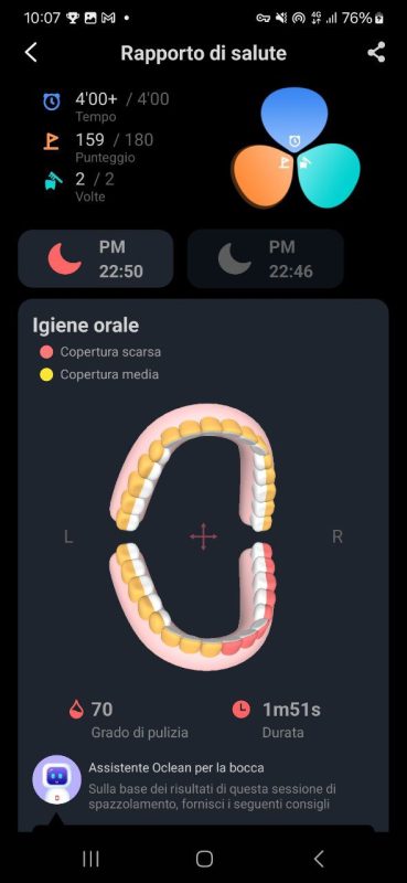 Oltre a questo, viene mostrato anche un punteggio che incentiva le operazioni di lavaggio dei denti. Questo sistema gamificato aiuta a sviluppare e mantenere buone abitudini di igiene orale.