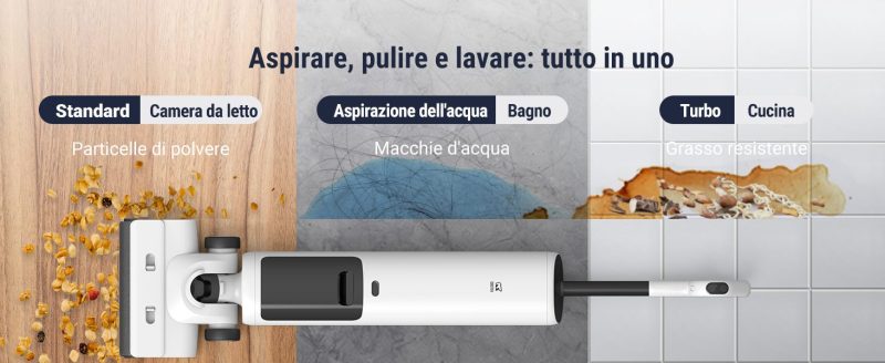 Esattamente come i concorrenti, anche lui con un solo passaggio aspira tutta la sporcizia (solidi e liquidi) e lava il pavimento: in questo modo, con un solo dispositivo otteniamo l'effetto combinato di aspirapolvere e mocio, cosa che ci garantisce un enorme risparmio di tempo e fatica nella pulizia della casa.