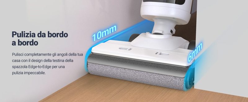 Come già segnalato, la nuova spazzola più compatta permette infine di arrivare praticamente a filo con muri e battiscopa. Si tratta di un importante miglioramento che rende la pulizia praticamente perfetta.