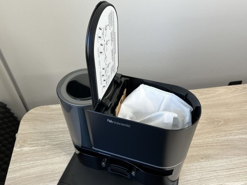 All'interno della base troviamo un sacchetto da 2,5L per la raccolta della polvere: dopo ogni pulizia (o quando vogliamo), il robot svuota automaticamente il suo cassettino di raccolta della polvere, riducendo la manutenzione al minimo.
