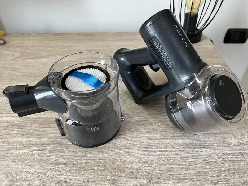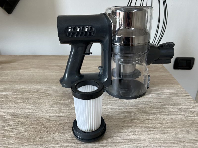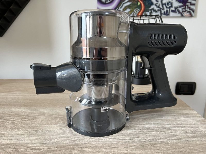 Chiaramente il contenitore si può smontare dal corpo dell’aspirapolvere e lavare completamente, così come tutto il sistema di filtri HEPA.