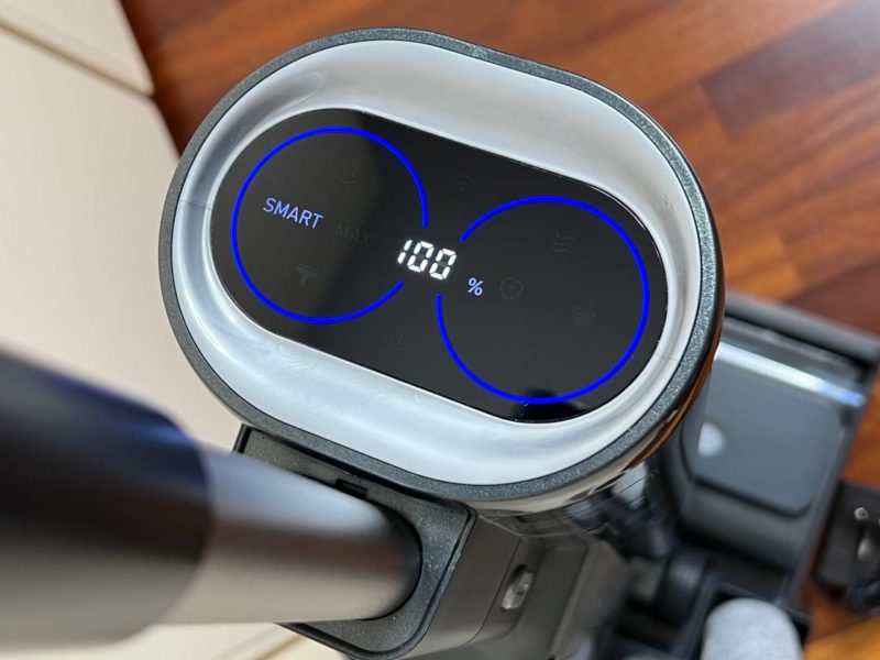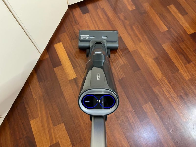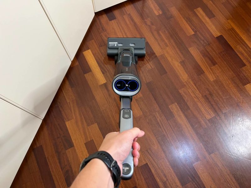 Si preme il tasto d’accensione, si inclina l’aspirapolvere e questo inizierà a pulire senza che sia necessario modificare alcun parametro. Proscenic WashVac F20 entra in funzione dopo averlo inclinato leggermente ed automaticamente si spegne in posizione verticale.